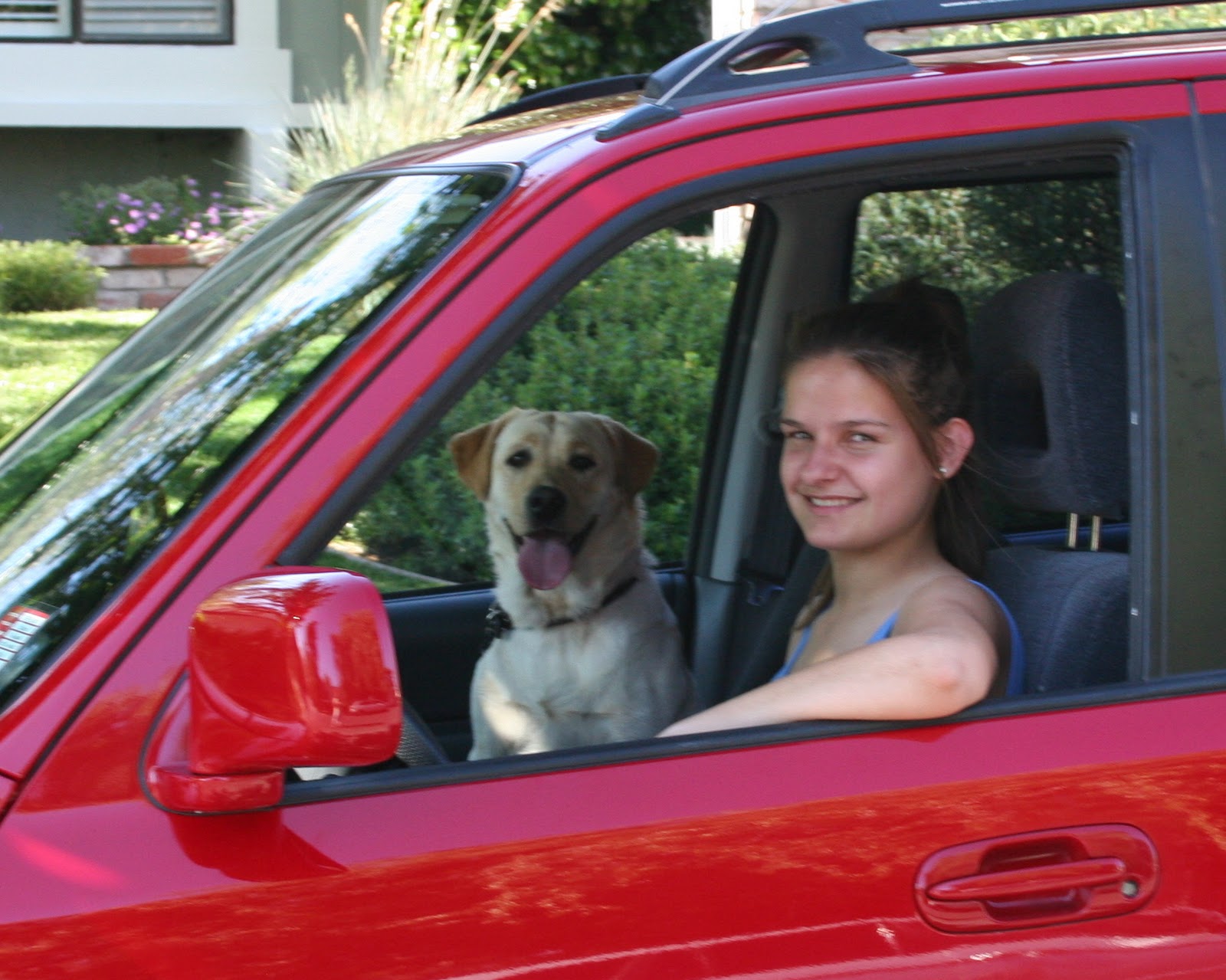 My baby is driving! She and her little yellow Lab are inseperable so the Lab goes along too, whenever possible.When her brothers and her sister hopped behind the wheel and sped off, it didn’t bother me. But this has me feeling sad. No more talks on the way to and from school, no more picking her up at the movies at 11PM, no more driving her to and from sleepovers or quick trips to Target for supplies for the latest school project…wait a minute! What am I complaining about? On second thought, this is great!