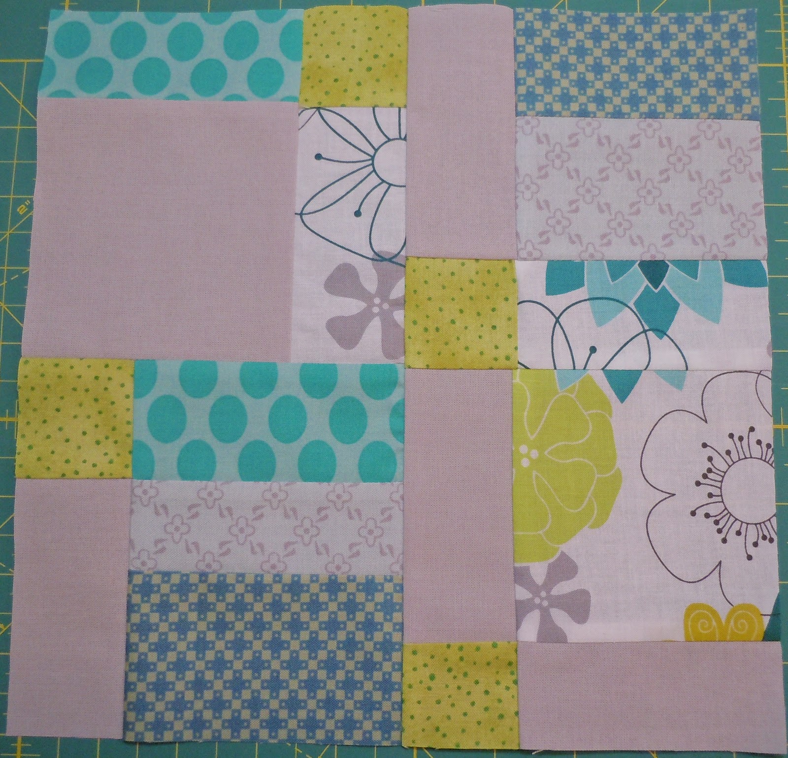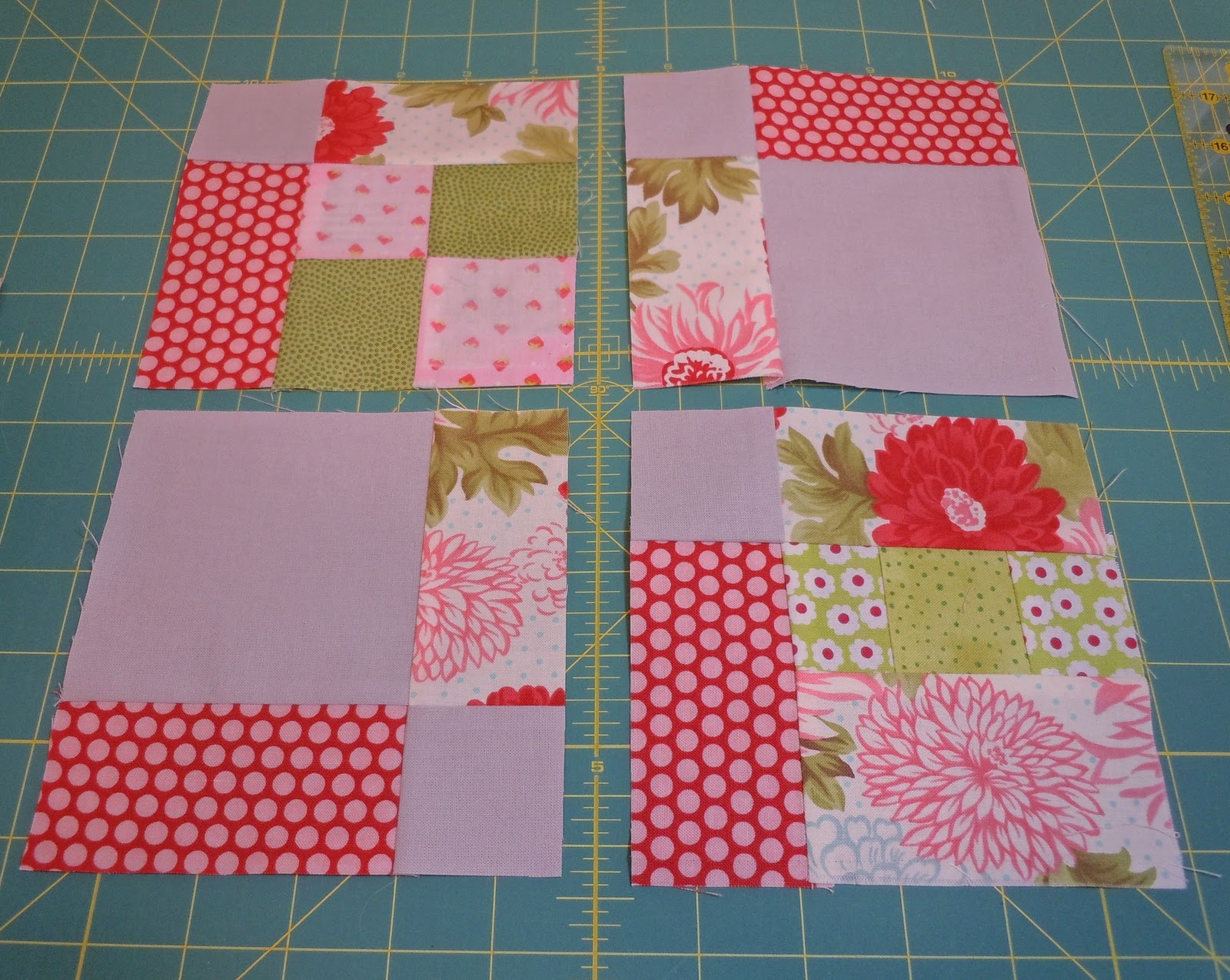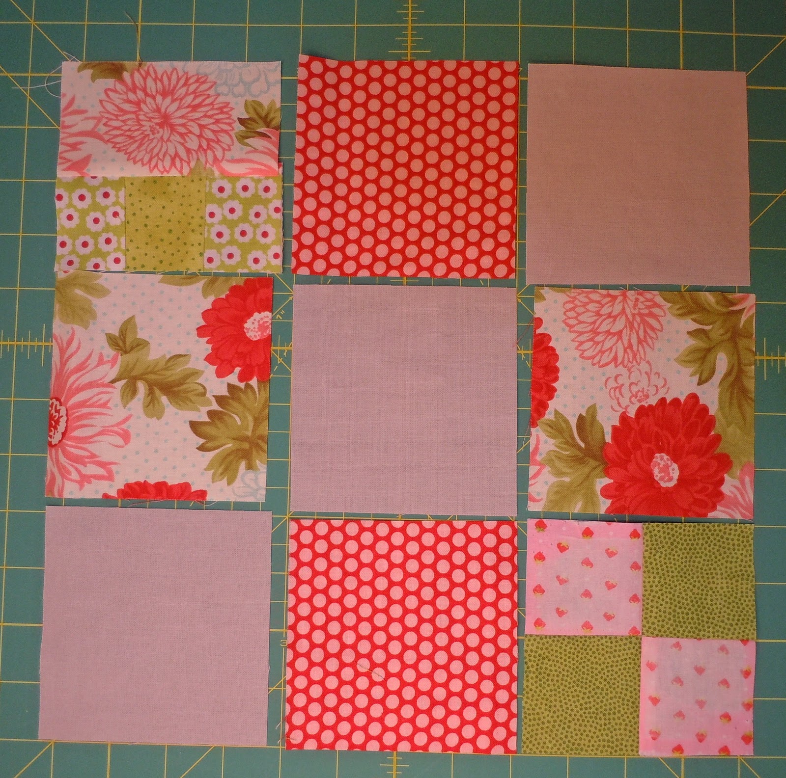 Nine four-inch blocks. One or two of the blocks will need to be pieced so I can work in those little two-inch lovies. She gave me four fat quarters of fabric that were pink, blue, green and gray so those are the colors I will use.?