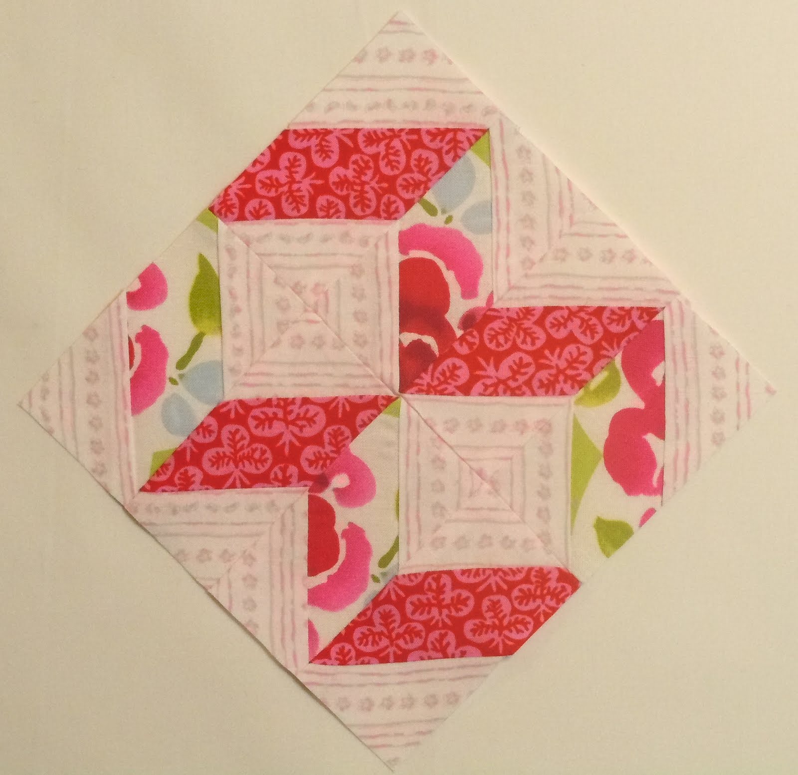 And, finally, this is Ribbons, and it is block #74. This was my favorite this week. It was a little risky using the light pink stripe for the background, but it worked out okay. I think this would make a great border. Now it’s time to get started on next week’s group.