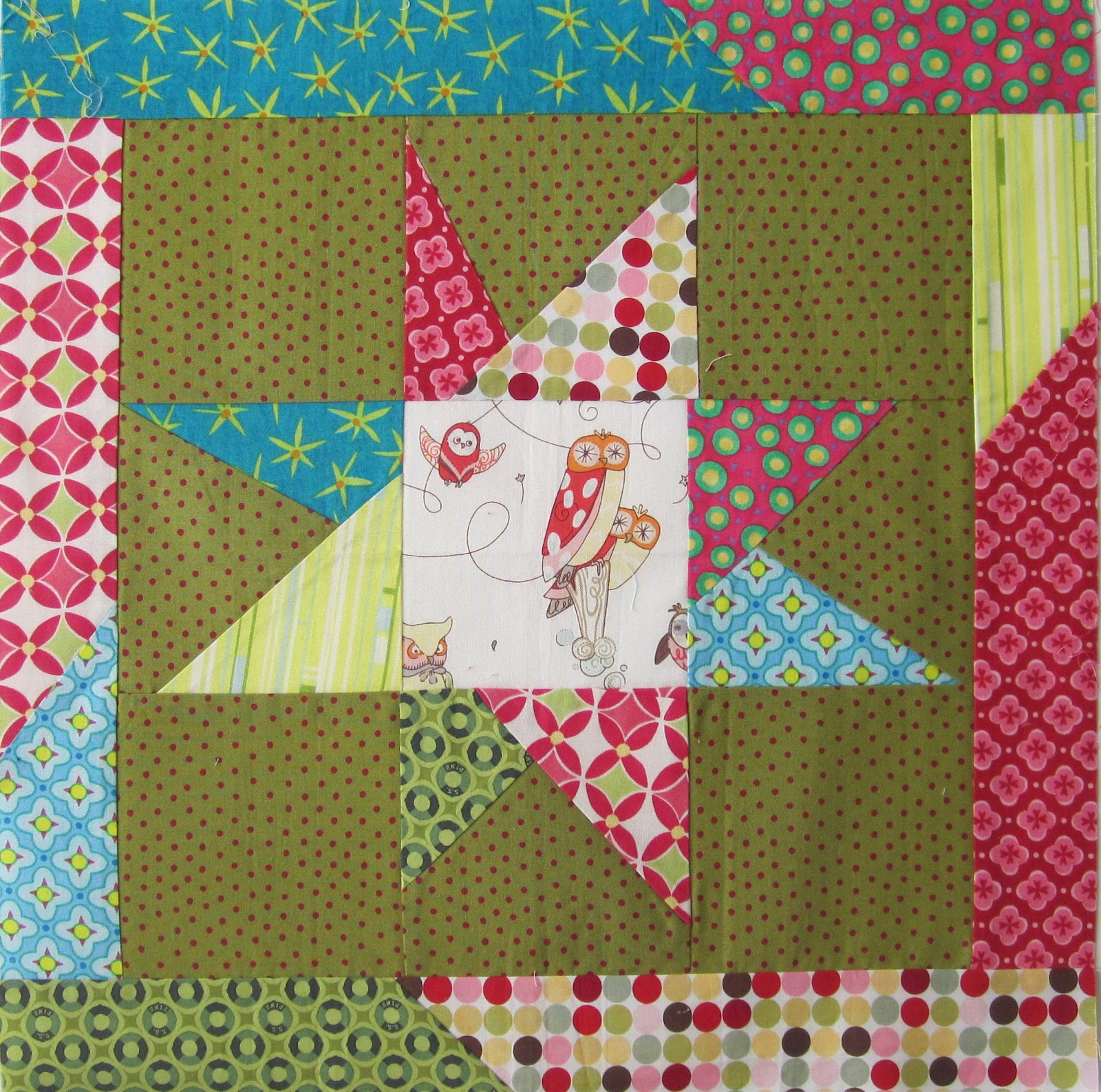 In the Journal Round Robin Bee, Vickie asked for a star block of any size, using pieces of an adorable owl print. This is Vickie’s starter block: