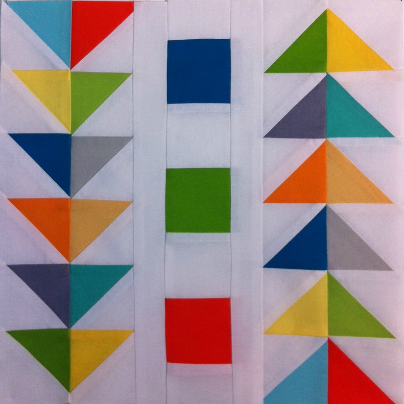In my last post I explained the Modern Quilt Guild’s block challenge. You can submit up to three 12 1/2″ by any other dimension block, using only the colors in the Guild’s logo. I am going to submit a third block which will be more abstract than these. I have a preliminary idea but it needs a little more time to percolate.