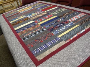 This lovely quilt was a custom design done by Linda Gutherie McClelland. For those of you who have ties and need some help getting them into a quilt, you can find Linda on Etsy.